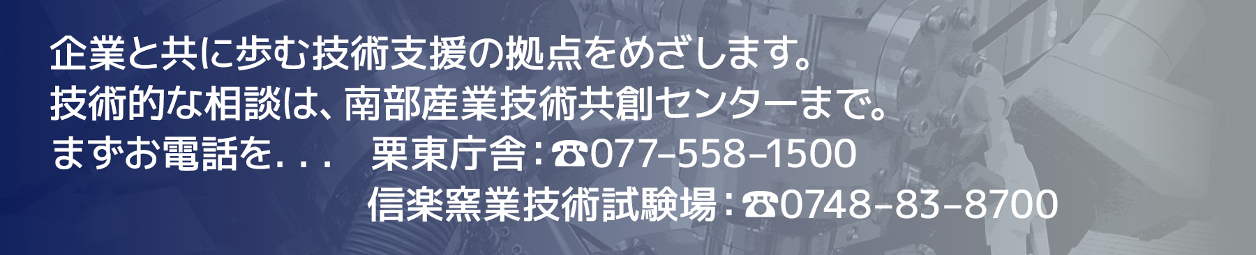 【令和8年4月1日〜】「滋賀県南部産業技術共創センター」へ、機関名称変更のお知らせ 2026/02/24 滋賀県工業技術総合センターは令和8年4月1日より以下のとおり名称を変更いたします。 ・滋賀県南部産業技術共創センター お知らせ テクノネットワークNo.145(2026/春号)発行のお知らせ 2026/03/04 2026/春号(2026年3月発行) 【表紙】「しがテックイノベーション創出事業」の展開について 【機器紹介】イノベーションベース機器紹介:非接触微細形状測定機、表面粗さ測定機、触針計、自動分光エリプソメータ、フラッシュ法熱物性測定装置、UHPLC・GPCシステム、高精細樹脂3Dプリンタ、マイクロスコープレーザー元素分析装置、分析機能付き走査型電子顕微鏡、令和7年度競輪補助物件:三次元測定機 【技術解説】ガスクロマトグラフィー質量分析法における前処理 ~脂肪酸分析~ レンタルラボ入居者募集中 2026/03/01 ■募集する室/5号室(約50m2) ■入居開始時期/令和8年3月以降 ■募集締切/令和8年3月31日(火) 【令和8年4月1日〜】「滋賀県南部産業技術共創センター」へ、機関名称変更のお知らせ 2026/02/24 滋賀県工業技術総合センターは令和8年4月1日より以下のとおり名称を変更いたします。 ・滋賀県南部産業技術共創センター 3月31日(火)の設備利用について【必ずお読みください!】 2026/01/27 所内設備のメンテナンスに伴い、使用料および手数料の支払いを停止いたします。 令和8年3月31日(火)に設備利用を希望される場合は、前日(令和8年3月30日(月)16時)までに支払いをお願いします。 皆さまにはご不便をおかけいたしますが、ご理解とご協力をお願いします。 公益財団法人JKA競輪補助機器の導入 2025/12/25 工業技術総合センターでは、県内企業の皆さまの製品開発などに対してより質の高い環境を提供できるよう、公益財団法人JKAの補助事業(競輪)を活用して新しい機器を整備しております。令和7年度は「三次元測定機」を導入しました。 工業技術総合センター<栗東庁舎>でキャッシュレス決済がご利用いただけます 2024/11/28 過去のお知らせ 2024/04/01 関連リンク