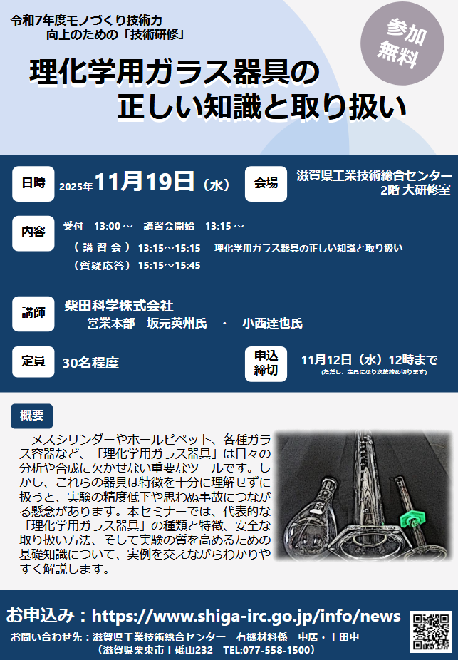 11/19(水)技術研修「理化学用ガラス器具の正しい知識と取り扱い」開催のお知らせ