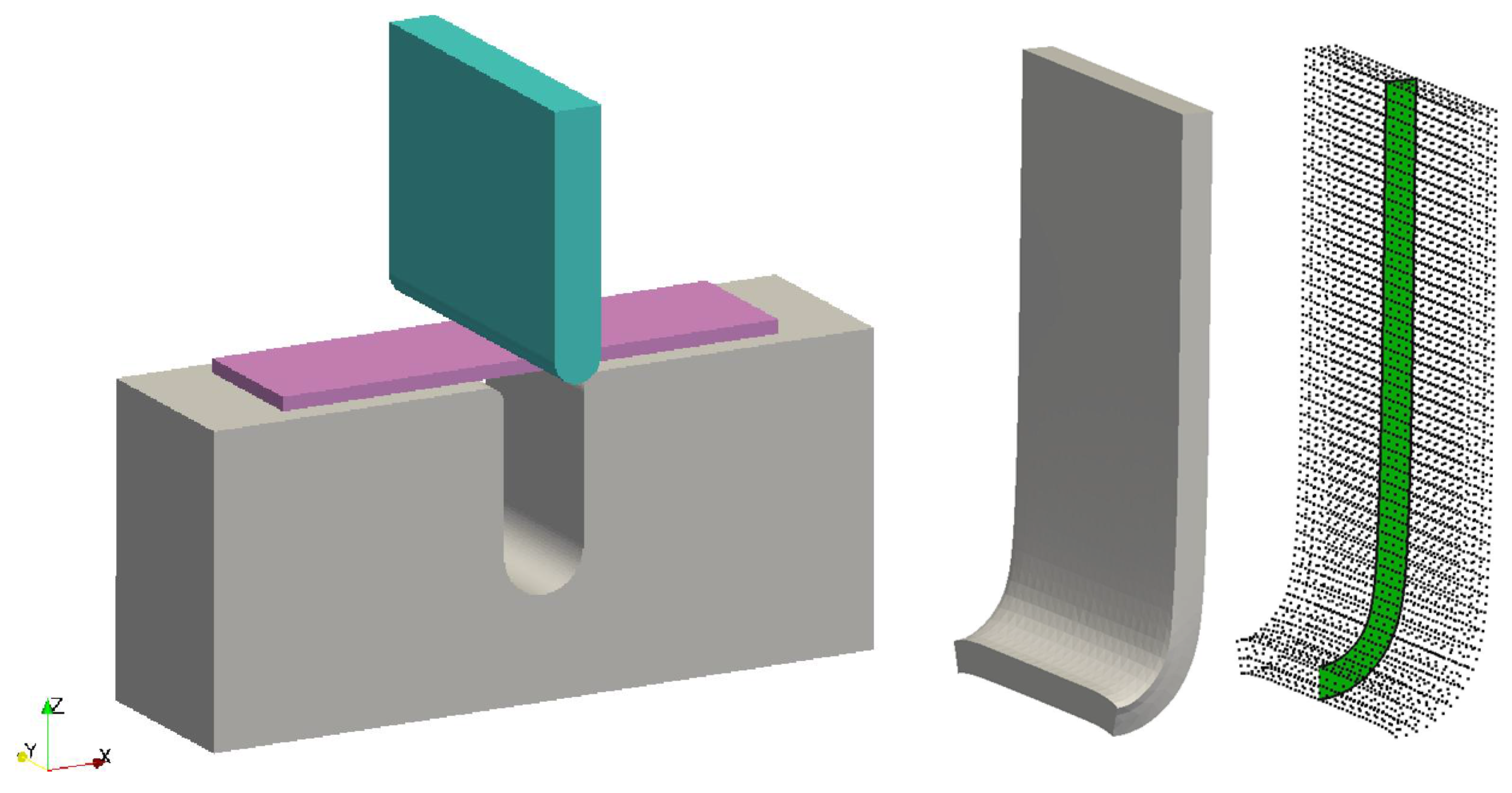 - プレス加工の解析に必要な要素(接触・大変形)を含む最も単純なモデルとして型曲げ試験を例に取り、オープンCAE(Salome-meca)を用いて解析した。